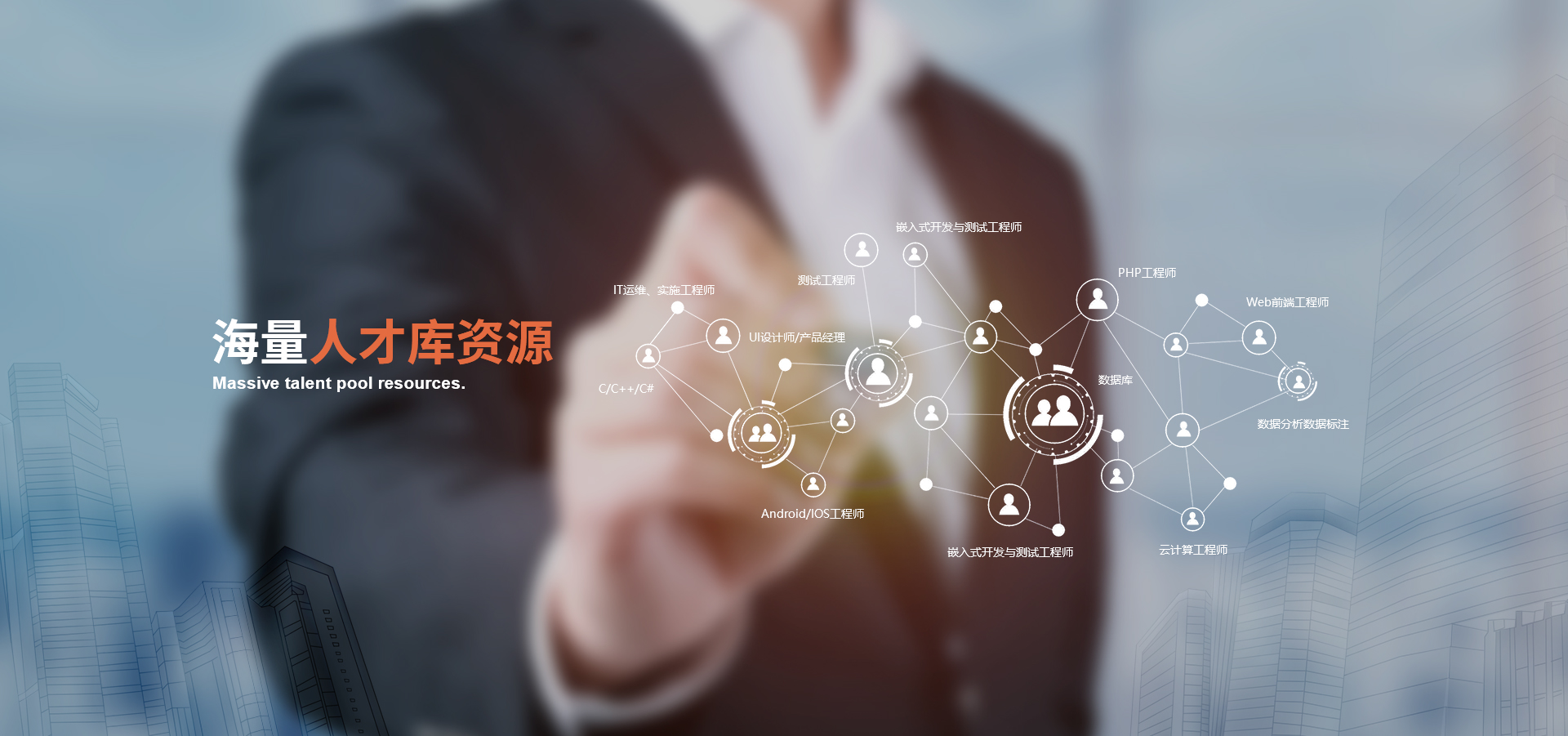 擁有超10萬(wàn)以上的人才儲(chǔ)備;包括專(zhuān)家級(jí)、、資深級(jí)、高級(jí)、中級(jí)等各技術(shù)崗位,能滿(mǎn)足客戶(hù)快速用人的需求